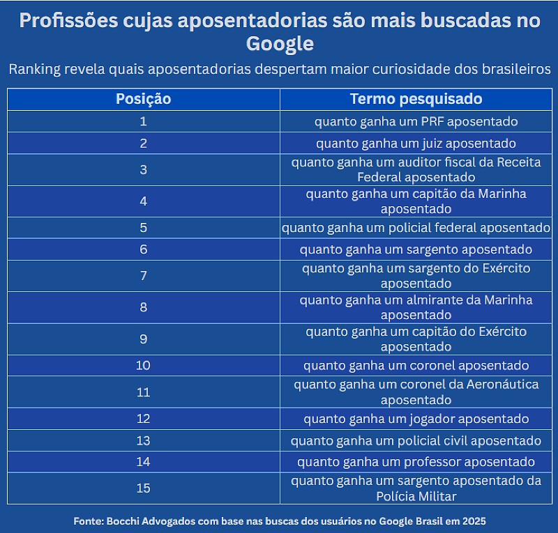 Um levantamento realizado pela Bocchi Advogados, escritório especializado em Direito Previdenciário e Trabalhista, analisou cerca de 200 mil buscas feitas no Google ao longo do último ano para identificar quais profissões mais chamam a atenção quando o tema é quanto ganha um aposentado.