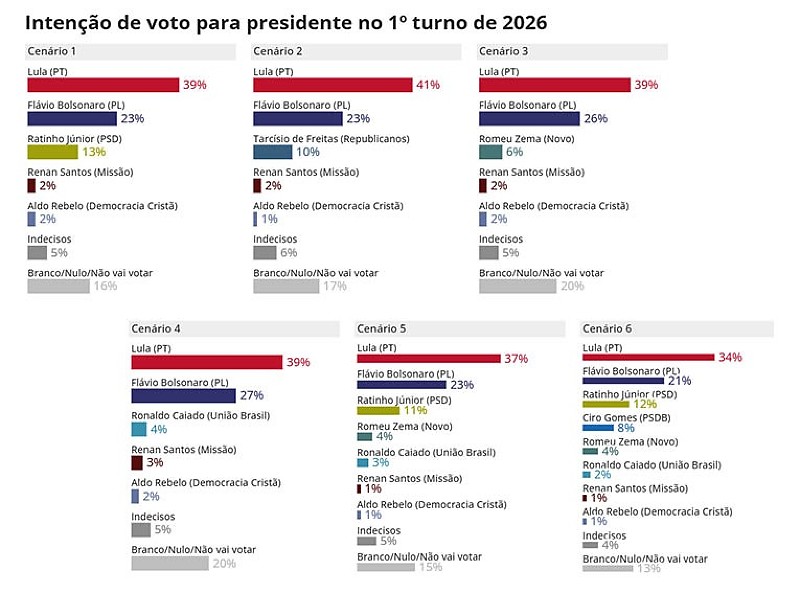 Dez meses antes da eleição presidencial, nova pesquisa Genial/Quaest divulgada na terça (16) aponta que o presidente Lula (PT) lidera a disputa pela Presidência em todos os cenários, e que no primeiro levantamento em que é citado como indicado de Jair Bolsonaro para ser candidato, seu filho senador Flávio Bolsonaro (PL-RJ) tem o melhor desempenho entre nomes da oposição, superando governadores de direita. Em projeções para o segundo turno, Flávio reduziu a vantagem de Lula: tanto o parlamentar quanto o governador Tarcísio de Freitas (Republicanos-SP) perderiam por dez pontos percentuais. Embora 54% dos eleitores avaliem que o ex-presidente errou ao indicar o filho, aliados interpretaram o resultado como um ponto de virada para as pretensões de Flávio. A fatia do eleitorado que defende a candidatura de Lula subiu cinco pontos percentuais. A maioria, no entanto, afirma não querer vê-lo na urna. A aprovação do governo ficou estável: 48% aprovam e 49% desaprovam. Encomendada pela Genial Investimentos, a pesquisa da Quaest ouviu 2.004 pessoas com 16 anos acima entre os dias 11 e 14 de dezembro. A margem de erro é de dois pontos para mais ou para menos e o nível de confiança é de 95%.
