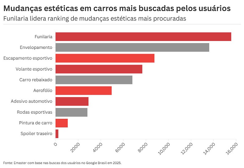 A base de dados foi extraída do Google Brasil, e as métricas revelaram a funilaria, o envelopamento e o escapamento esportivo como as três customizações mais pesquisadas por quem deseja personalizar o seu carro.