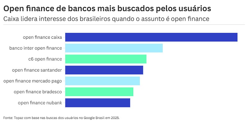 Um estudo da Topaz, empresa de tecnologia especializada em soluções financeiras digitais, analisou, entre janeiro e outubro de 2025, o interesse dos usuários sobre o Open Finance, a partir de dados extraídos do Google Brasil. O objetivo foi identificar quais instituições financeiras despertam mais atenção quando o assunto é compartilhamento de dados.