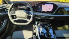 O interior segue o conceito da Audi centrado no condutor. O painel combina o Audi Virtual Cockpit de 11,9 polegadas com o display panorâmico curvo de 14,5 polegadas, equipado com tecnologia OLED. A operação dos comandos foi atualizada, enquanto o sistema de luz ambiente permite 30 opções configuráveis. O ar-condicionado automático de três zonas e os bancos dianteiros com ajustes elétricos e memória para o motorista complementam a cabine.