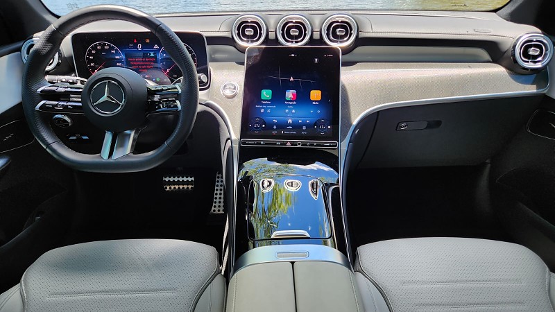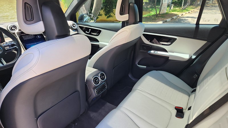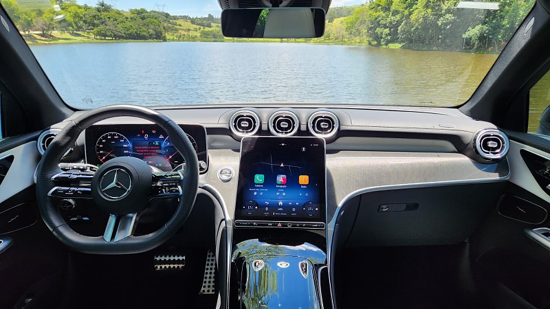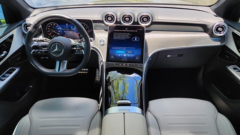 A partir desse cenário, iniciei a avaliação do GLC 300 4MATIC AMG Line 2026 em trechos urbanos e rodoviários. No dia a dia pela cidade, o funcionamento do conjunto híbrido leve proporcionou saídas suaves e retomadas consistentes. O nível de consumo chamou atenção logo nos primeiros dias, permitindo rodar praticamente uma semana sem abastecer, fato relevante para um SUV de médio para grande porte. O MBUX auxiliou a adaptar os trajetos, principalmente com informações de trânsito em tempo real e comandos simples executados pelo assistente de voz. A ergonomia dos bancos dianteiros, com ajustes elétricos e memória, facilitou o uso em diferentes horários e ritmos da rotina.