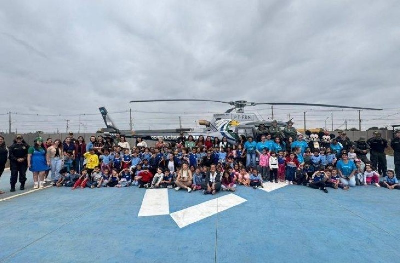 Durante o evento, os alunos conheceram viaturas operacionais, interagiram com integrantes da Coordenadoria-Geral de Policiamento Aéreo (CGPA) e viram de perto o helicóptero Harpia, despertando encanto e admiração.