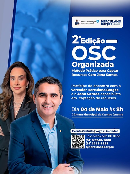 A Câmara Municipal de Campo Grande recebe, na próxima segunda-feira (4), a 2ª edição do curso “OSC Organizada – Método Prático de Captação de Recursos”, com a especialista Jana Santos. O encontro começa às 8h, com entrada gratuita.