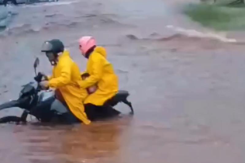 A enxurrada chegou a isolar veículos, incluindo uma moto com dois ocupantes, e cobriu parcialmente carros de passeio em vias da cidade, mostrando a intensidade da chuva em curtos períodos.