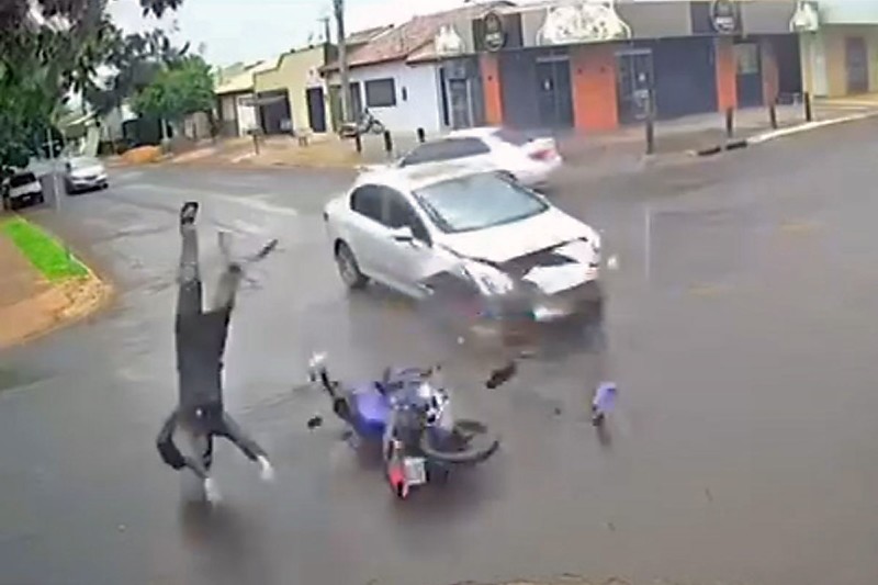 Imagens publicadas em redes sociais mostram que o primeiro carro parou, respeitando a preferencial, mas o motociclista não conseguiu desviar a tempo. O piloto ainda tentou buzinar para alertar o motorista, mas a colisão foi inevitável.