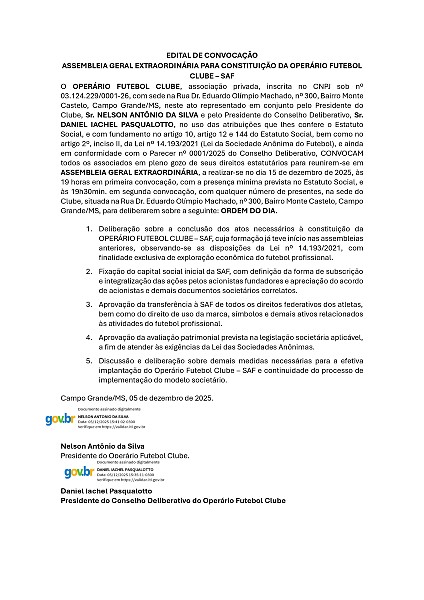 EDITAL DE CONVOCAÇÃO - ASSEMBLEIA GERAL EXTRAORDINÁRIA PARA CONSTITUIÇÃO DA OPERÁRIO FUTEBOL CLUBE – SAF