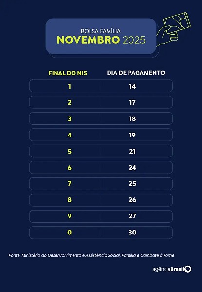 A Caixa Econômica Federal começa a pagar a parcela de novembro do Bolsa Família. Recebem nesta sexta-feira (14) os beneficiários com Número de Inscrição Social (NIS) de final 1. Ao todo cerca de 18,7 milhões de famílias receberão o benefício neste mês.