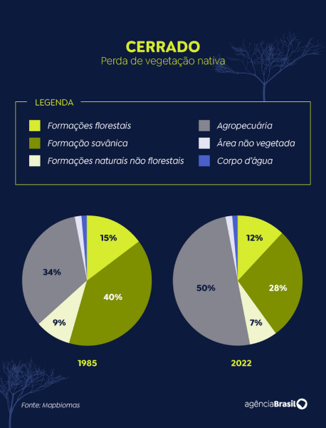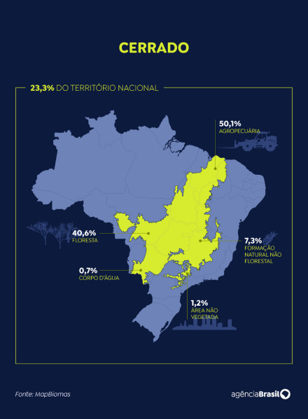 Atualmente, metade da área do Cerrado é ocupada pela produção de animais e grãos. Em 1985, a agropecuária ocupava pouco mais de um terço (34%) do bioma, segundo estudo do MapBiomas. O levantamento feito com dados de satélites revelou que, entre 1985 e 2022, a savana brasileira perdeu 25% da sua vegetação nativa para o desmatamento.
