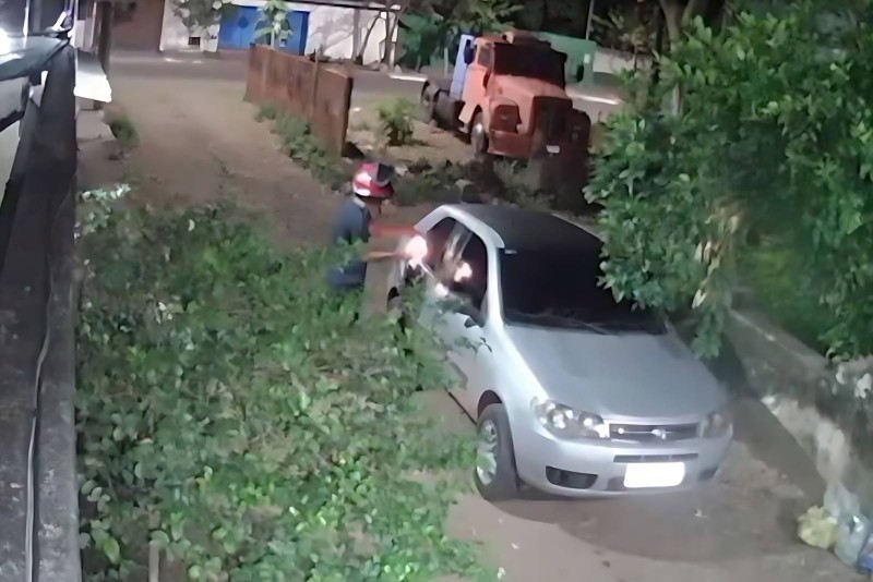 Imagens de câmeras de segurança registraram a ação, mostrando o momento em que um dos autores arremessa uma pedra contra o automóvel e, em seguida, utiliza uma garrafa com líquido inflamável para provocar o incêndio.