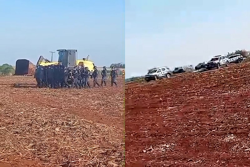 Indígenas Guarani e Kaiowá registraram, na manhã desta sexta-feira (17), o momento em que a Tropa de Choque da Polícia Militar de Mato Grosso do Sul escolta um trator e atua na área da Terra Indígena Guyraroká, em Caarapó, região identificada e delimitada oficialmente pela Funai desde 2011.