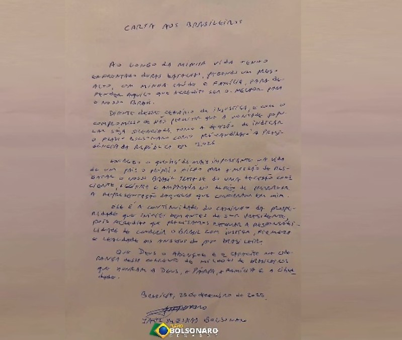 Flávio explicou que a carta foi escrita pelo pai no dia 23, quando ele estava na Superintendência da Polícia Federal, em Brasília, onde permanece preso desde novembro. A decisão é apresentada como consciente e amparada pelo compromisso com a “vontade popular”.