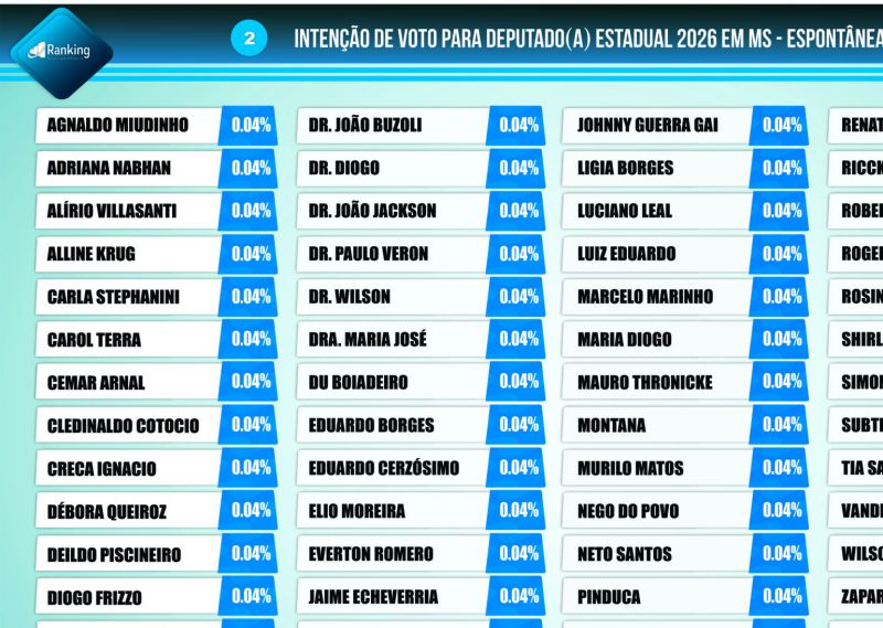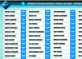 Na modalidade espontânea, o atual governador Eduardo Riedel lidera com 25%, seguido por Capitão Contar com 7,2%, Fábio Trad com 3,8%, Reinaldo Azambuja com 3,6% e Rose Modesto com 3,2%. Em muitos casos, os nomes mais lembrados ficaram abaixo de 1%, e 51% declararam “não sabem” ou optaram por branco ou nulo.