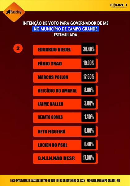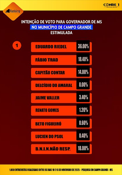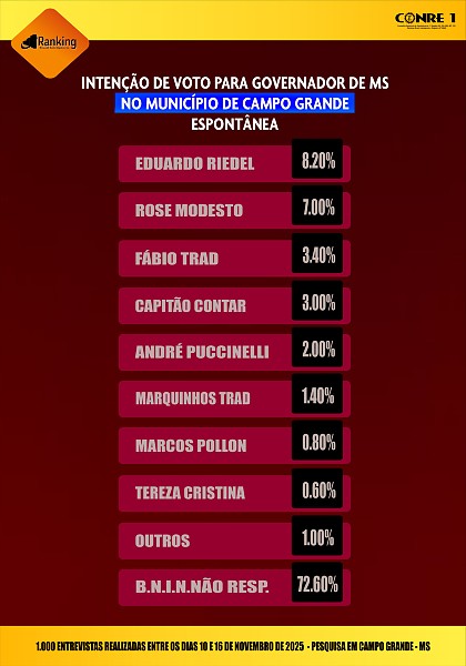A pesquisa realizada pelo Instituto Ranking Brasil Inteligência, entre 10 e 16 de novembro, com 1.000 eleitores de Campo Grande e distritos, aponta que a corrida pelo governo de Mato Grosso do Sul começa marcada por forte indefinição. O levantamento, encomendado pela Rede Top FM, tem margem de erro de 3 pontos percentuais e 95% de confiança.