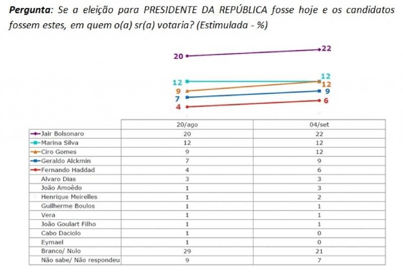 De acordo com a pesquisa, Jair Bolsonaro (PSL) lidera a corrida presidencial, seguido por Marina Silva (REDE) e Ciro Gomes (PDT) que estão empatados. Em seguida, aparece o nome do ex-governador de São Paulo, Geraldo Alckmin. Em relação à pesquisa anterior, Bolsonaro que tinha 20% na primeira rodada, oscila positivamente dentro da margem de erro de 2 pontos percentuais e tem hoje 22%; Marina Silva segue com 12% das intenções de voto, mesmo percentual de Ciro Gomes, que cresce 3 pontos (antes tinha 9%). Geraldo Alckmin também tem oscilação positiva de 2 pontos percentuais e vai de 7% para 9%.