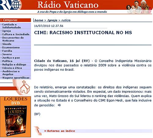 Site da Rádio Vaticano traz comentário sobre levantamento do Cimi em todo o Brasil